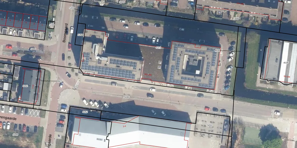 Het perceel waarop het adres ligt is BKP00-D-5371. De afkorting 'BKP00' staat voor kadastrale gemeente Boskoop. De oppervlakte van het perceel is 4960 m². Dat is groter dan gemiddeld in Boskoop, waar de gemiddelde perceeloppervlakte op 1879,36 m² ligt. Het grootste perceel in de kadastrale gemeente is 20,7 ha. Het kleinste perceel heeft een oppervlakte van 0 m². Op het perceel liggen in totaal 83 adressen. De huidige grenzen van het perceel zijn digitaal in de Basisregistratie Kadaster (BRK) geregistreerd op 28-06-2017.