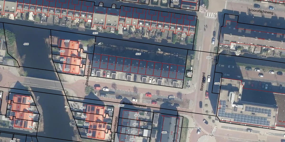 Brederodepeer 11 is gelegen op kadastraal perceel BKP00D5636. Deze kadastrale aanduiding is uniek en wordt gebruikt door het Kadaster om eigendomsrechten en andere zakelijke rechten vast te leggen. Het perceel maakt onderdeel uit van de kadastrale gemeente Boskoop.