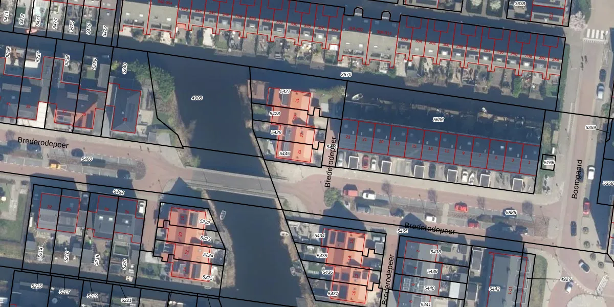 Brederodepeer 25 is gelegen op kadastraal perceel BKP00D5445. Deze kadastrale aanduiding is uniek en wordt gebruikt door het Kadaster om eigendomsrechten en andere zakelijke rechten vast te leggen. Het perceel maakt onderdeel uit van de kadastrale gemeente Boskoop.
