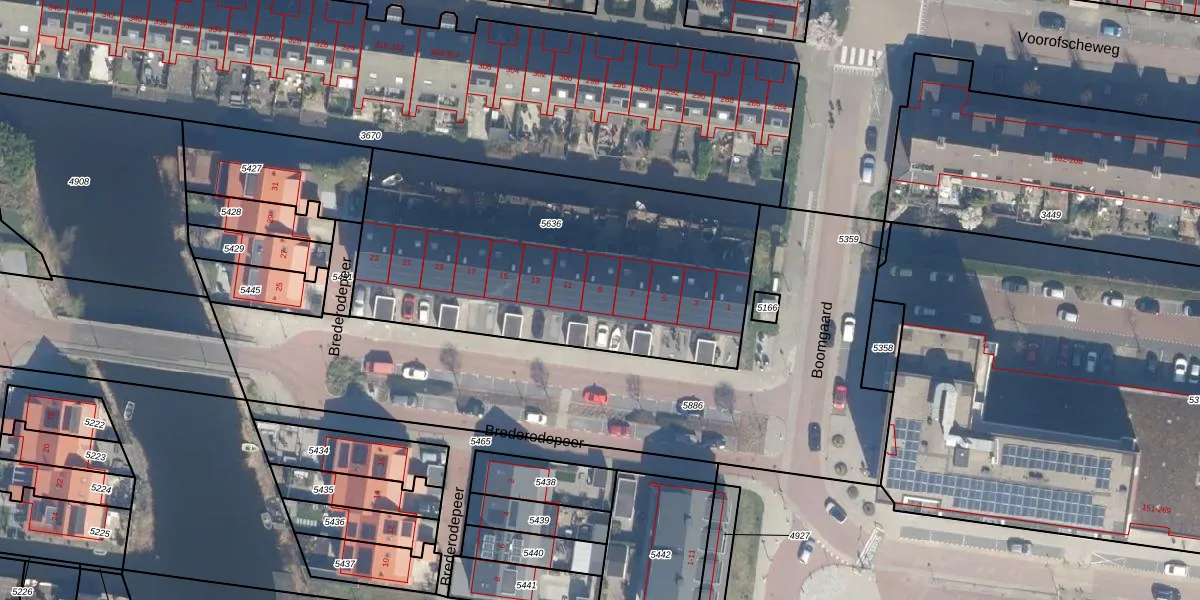 Brederodepeer 9 is gelegen op kadastraal perceel BKP00D5636. Deze kadastrale aanduiding is uniek en wordt gebruikt door het Kadaster om eigendomsrechten en andere zakelijke rechten vast te leggen. Het perceel maakt onderdeel uit van de kadastrale gemeente Boskoop.