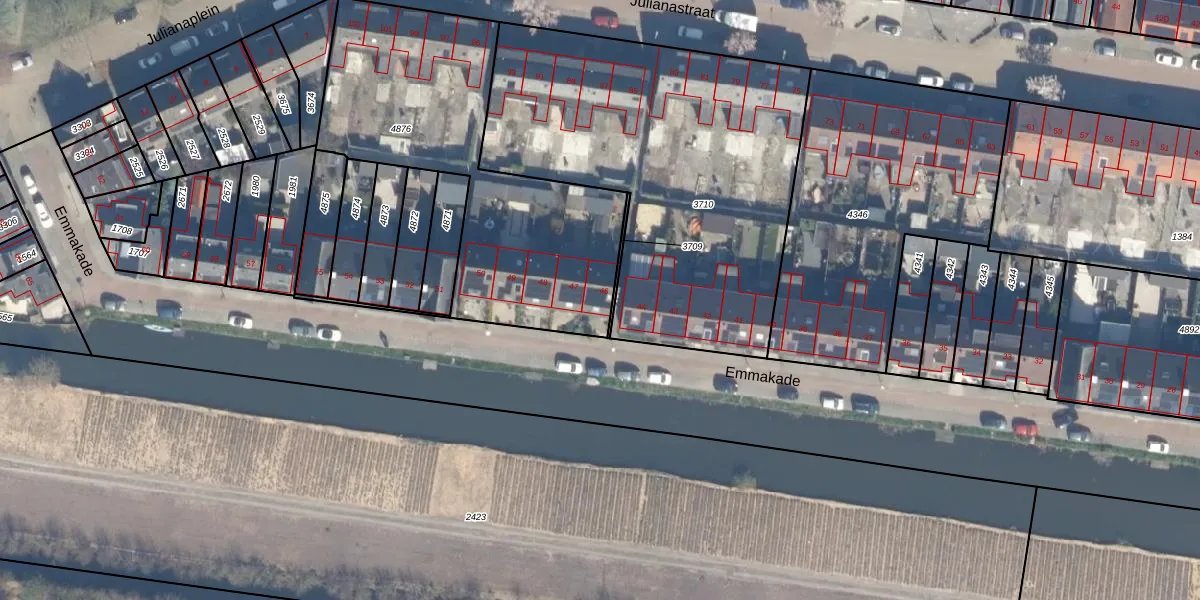 Emmakade 46 is gelegen op kadastraal perceel BKP00D4876. Deze kadastrale aanduiding is uniek en wordt gebruikt door het Kadaster om eigendomsrechten en andere zakelijke rechten vast te leggen. Het perceel maakt onderdeel uit van de kadastrale gemeente Boskoop.