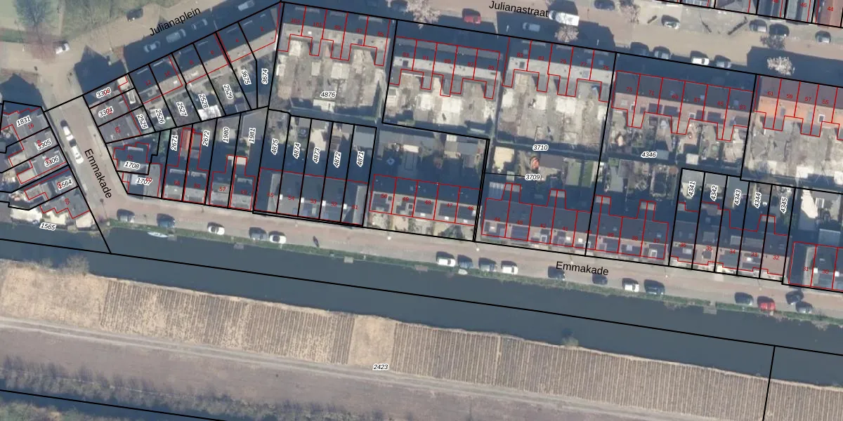Het perceel waarop Emmakade 48 staat heeft een oppervlakte van 1345 m². Dit is een zeer groot perceel. De perceeloppervlakte wordt geregistreerd door het Kadaster. Gedetailleerde informatie over de maten van dit perceel kunt u vinden in het rapport Kadastrale kaart met maatvoering van Emmakade 48.