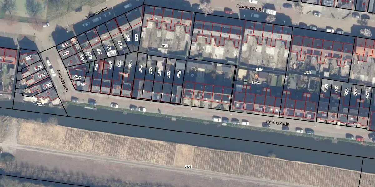 Het perceel waarop Emmakade 50 staat heeft een oppervlakte van 1345 m². Dit is een zeer groot perceel. De perceeloppervlakte wordt geregistreerd door het Kadaster. Gedetailleerde informatie over de maten van dit perceel kunt u vinden in het rapport Kadastrale kaart met maatvoering van Emmakade 50.