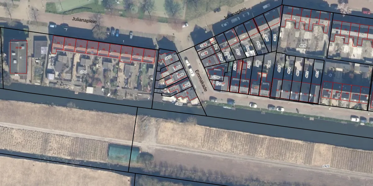 Het perceel waarop Emmakade 65 staat heeft een oppervlakte van 263 m². Dit is een middelgroot perceel. De perceeloppervlakte wordt geregistreerd door het Kadaster. Gedetailleerde informatie over de maten van dit perceel kunt u vinden in het rapport Kadastrale kaart met maatvoering van Emmakade 65.