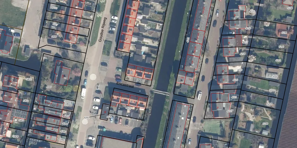 Ericastraat 6 is gelegen op kadastraal perceel BKP00B4620. Deze kadastrale aanduiding is uniek en wordt gebruikt door het Kadaster om eigendomsrechten en andere zakelijke rechten vast te leggen. Het perceel maakt onderdeel uit van de kadastrale gemeente Boskoop.