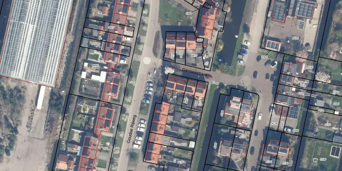 Genistastraat 1 is gelegen op kadastraal perceel BKP00B6439. Deze kadastrale aanduiding is uniek en wordt gebruikt door het Kadaster om eigendomsrechten en andere zakelijke rechten vast te leggen. Het perceel maakt onderdeel uit van de kadastrale gemeente Boskoop.