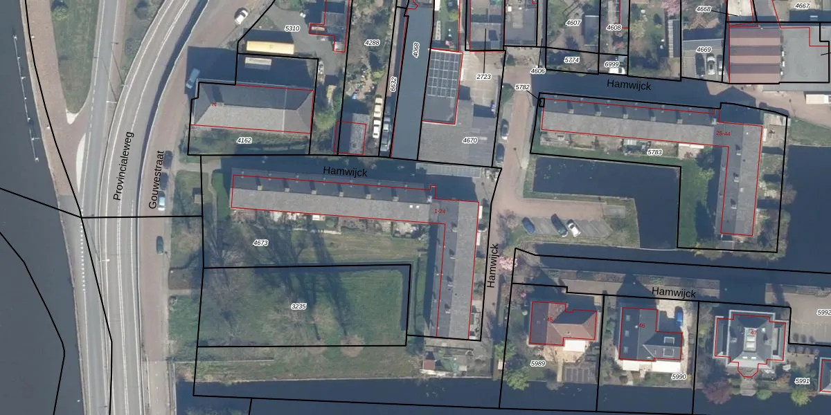 Het perceel waarop Hamwijck 14 staat heeft een oppervlakte van 2055 m². Dit is een zeer groot perceel. De perceeloppervlakte wordt geregistreerd door het Kadaster. Gedetailleerde informatie over de maten van dit perceel kunt u vinden in het rapport Kadastrale kaart met maatvoering van Hamwijck 14.