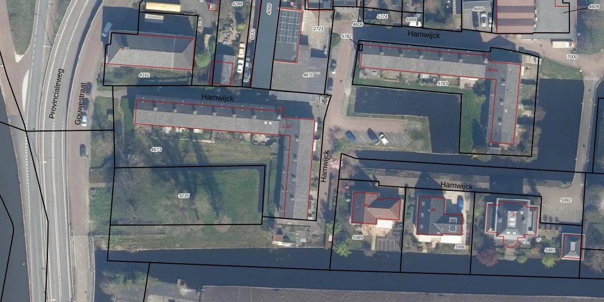 Het perceel waarop Hamwijck 18 staat heeft een oppervlakte van 2055 m². Dit is een zeer groot perceel. De perceeloppervlakte wordt geregistreerd door het Kadaster. Gedetailleerde informatie over de maten van dit perceel kunt u vinden in het rapport Kadastrale kaart met maatvoering van Hamwijck 18.