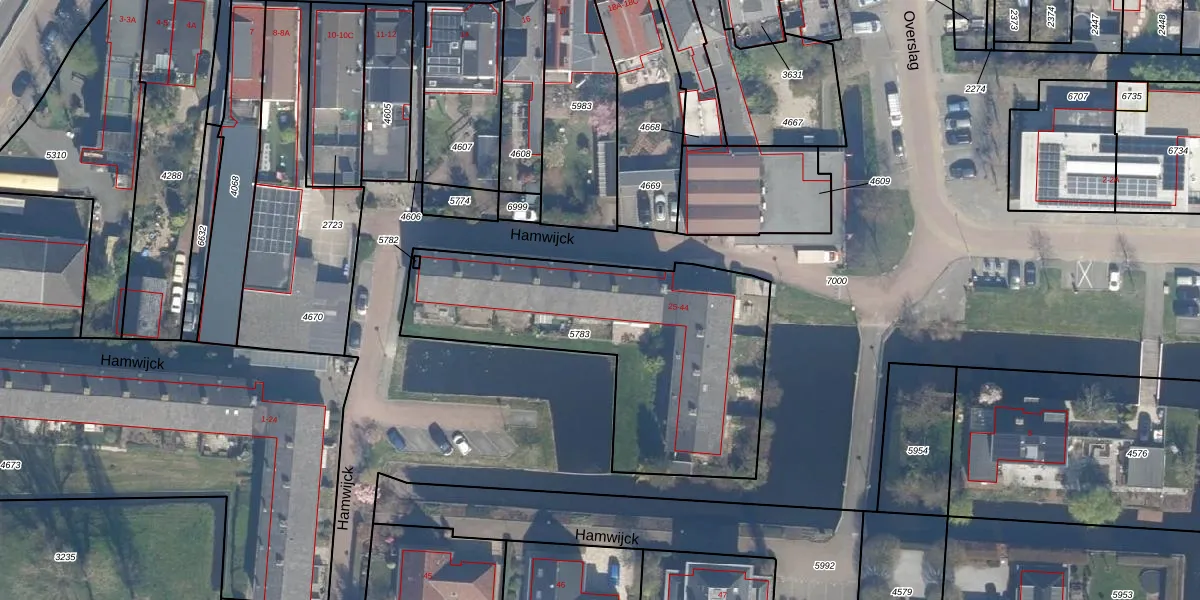 Het perceel waarop Hamwijck 35 staat heeft een oppervlakte van 1383 m². Dit is een zeer groot perceel. De perceeloppervlakte wordt geregistreerd door het Kadaster. Gedetailleerde informatie over de maten van dit perceel kunt u vinden in het rapport Kadastrale kaart met maatvoering van Hamwijck 35.