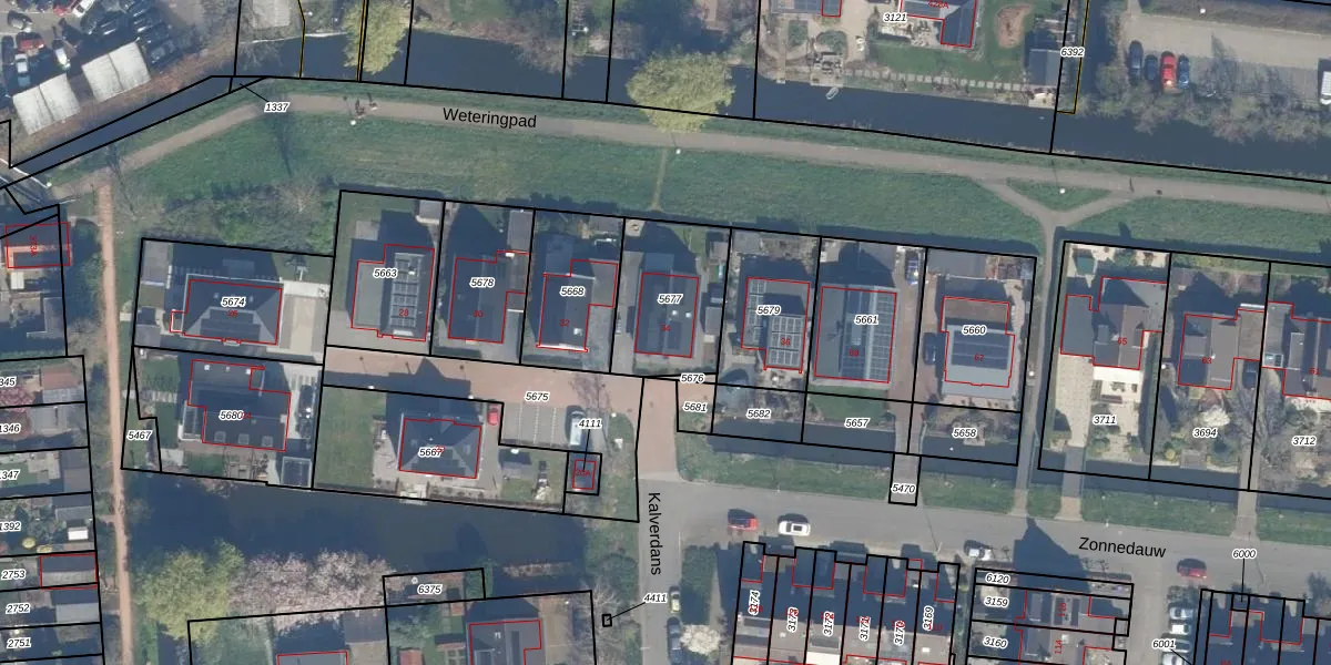 Het perceel waarop Kalverdans 34 staat heeft een oppervlakte van 370 m². Dit is een groot perceel. De perceeloppervlakte wordt geregistreerd door het Kadaster. Gedetailleerde informatie over de maten van dit perceel kunt u vinden in het rapport Kadastrale kaart met maatvoering van Kalverdans 34.