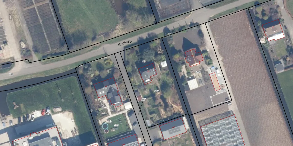 Kooiweg 21 is gelegen op kadastraal perceel BKP00L307. Deze kadastrale aanduiding is uniek en wordt gebruikt door het Kadaster om eigendomsrechten en andere zakelijke rechten vast te leggen. Het perceel maakt onderdeel uit van de kadastrale gemeente Boskoop.