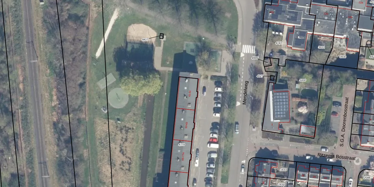 Mendelweg 41-B is gelegen op kadastraal perceel BKP00D4779. Deze kadastrale aanduiding is uniek en wordt gebruikt door het Kadaster om eigendomsrechten en andere zakelijke rechten vast te leggen. Het perceel maakt onderdeel uit van de kadastrale gemeente Boskoop.