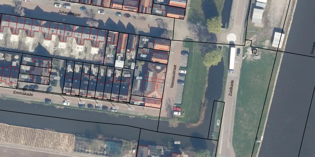 Het adres ligt op het perceel BKP00-D-1383, dat zich in de kadastrale gemeente Boskoop bevindt. Het perceel is 449 m² groot. Dat is kleiner dan de gemiddelde perceeloppervlakte in Boskoop, dat op 1883,96 m² ligt. De grootste perceeloppervlakte in de kadastrale gemeente is 20,7 ha. De kleinste oppervlakte bedraagt 0 m². Er zijn 9 adressen aanwezig op het perceel. De huidige grenzen van het perceel zijn digitaal in de Basisregistratie Kadaster (BRK) geregistreerd op 20-02-2007.