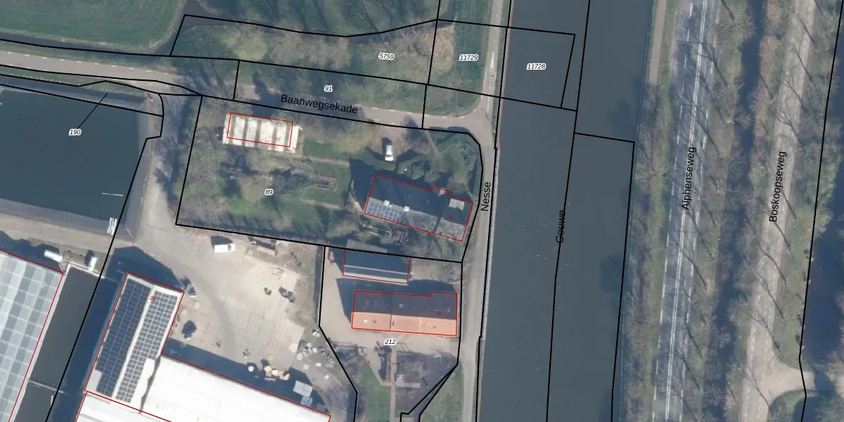 Het adres ligt op het perceel BKP00-L-89, dat zich in de kadastrale gemeente Boskoop bevindt. De oppervlakte van het perceel is 2145 m². Dat is groter dan gemiddeld in Boskoop, waar de gemiddelde perceeloppervlakte op 1882,49 m² ligt. De grootste perceeloppervlakte in de kadastrale gemeente is 20,7 ha. De kleinste oppervlakte bedraagt 0 m². Dit is het enige adres dat aanwezig is op het perceel. De laatste wijziging in het de Basisregistratie Kadaster (BRK) was op 22-08-2001.