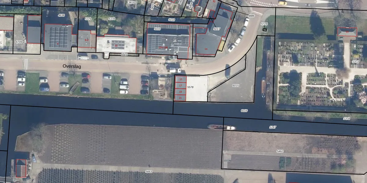 Overslag 19 is gelegen op kadastraal perceel BKP00B5578. Deze kadastrale aanduiding is uniek en wordt gebruikt door het Kadaster om eigendomsrechten en andere zakelijke rechten vast te leggen. Het perceel maakt onderdeel uit van de kadastrale gemeente Boskoop.