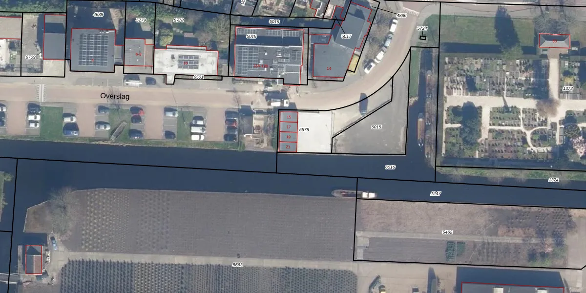 Overslag 21 is gelegen op kadastraal perceel BKP00B5578. Deze kadastrale aanduiding is uniek en wordt gebruikt door het Kadaster om eigendomsrechten en andere zakelijke rechten vast te leggen. Het perceel maakt onderdeel uit van de kadastrale gemeente Boskoop.