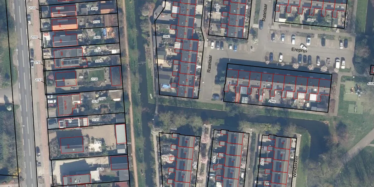 Het perceel waarop Ratelaar 15 staat heeft een oppervlakte van 1445 m². Dit is een zeer groot perceel. De perceeloppervlakte wordt geregistreerd door het Kadaster. Gedetailleerde informatie over de maten van dit perceel kunt u vinden in het rapport Kadastrale kaart met maatvoering van Ratelaar 15.