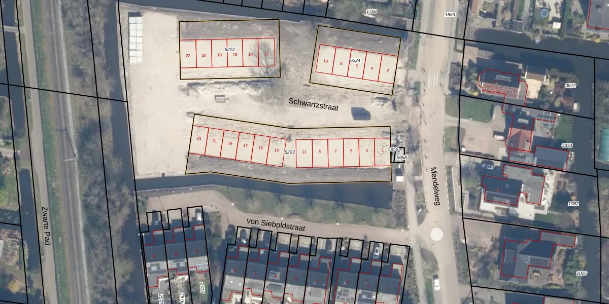 Het perceel waarop het adres ligt is BKP00-D-6223. De afkorting 'BKP00' staat voor kadastrale gemeente Boskoop. De gemiddelde perceelgrootte in Boskoop is 1876,03 m². Dit perceel is kleiner: de perceeloppervlakte bedraagt 1205 m². De grootste perceeloppervlakte in de kadastrale gemeente is 20,7 ha. De kleinste oppervlakte bedraagt 0 m². Er zijn 12 adressen aanwezig op het perceel. In de Basisregistratie Kadaster (BRK) werden de grenzen van het perceel geregistreerd op 03-03-2025.