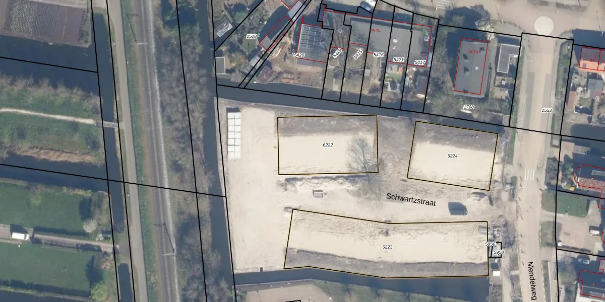 Het perceel waarop Schwartzstraat 20 staat heeft een oppervlakte van 626 m². Dit is een groot perceel. De perceeloppervlakte wordt geregistreerd door het Kadaster. Gedetailleerde informatie over de maten van dit perceel kunt u vinden in het rapport Kadastrale kaart met maatvoering van Schwartzstraat 20.