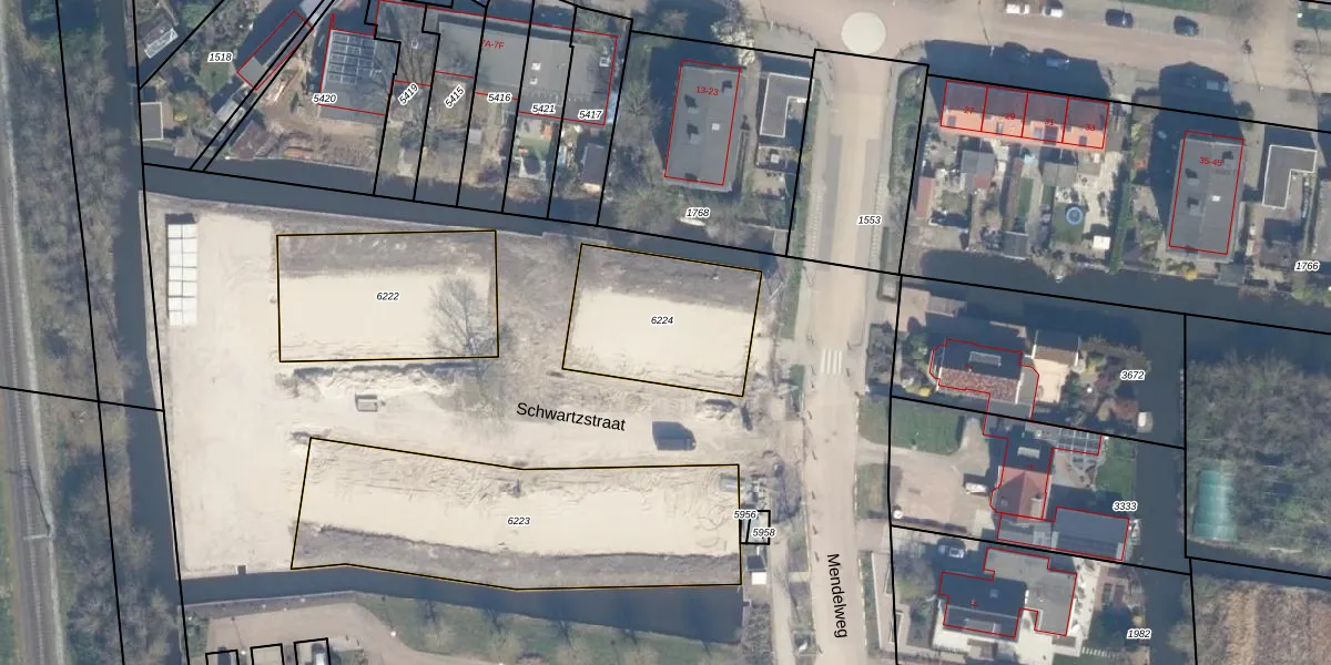 Het perceel waarop Schwartzstraat 6 staat heeft een oppervlakte van 523 m². Dit is een groot perceel. De perceeloppervlakte wordt geregistreerd door het Kadaster. Gedetailleerde informatie over de maten van dit perceel kunt u vinden in het rapport Kadastrale kaart met maatvoering van Schwartzstraat 6.