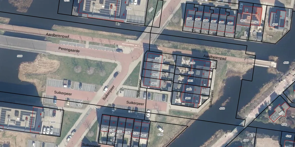 Suikerpeer 6 is gelegen op kadastraal perceel BKP00D5821. Deze kadastrale aanduiding is uniek en wordt gebruikt door het Kadaster om eigendomsrechten en andere zakelijke rechten vast te leggen. Het perceel maakt onderdeel uit van de kadastrale gemeente Boskoop.