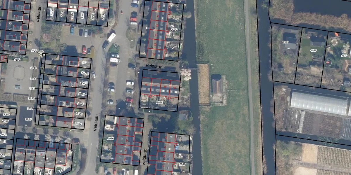 Veldlaan 61 is gelegen op kadastraal perceel BKP00D2988. Deze kadastrale aanduiding is uniek en wordt gebruikt door het Kadaster om eigendomsrechten en andere zakelijke rechten vast te leggen. Het perceel maakt onderdeel uit van de kadastrale gemeente Boskoop.