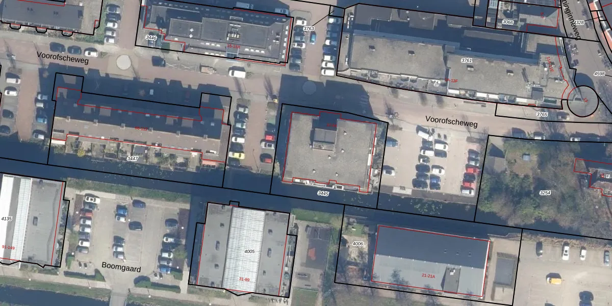 Voorofscheweg 54 is gelegen op kadastraal perceel BKP00D3445. Deze kadastrale aanduiding is uniek en wordt gebruikt door het Kadaster om eigendomsrechten en andere zakelijke rechten vast te leggen. Het perceel maakt onderdeel uit van de kadastrale gemeente Boskoop.
