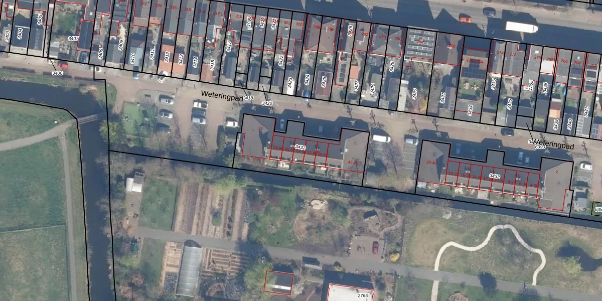 Weteringpad 54 is gelegen op kadastraal perceel BKP00D3432. Deze kadastrale aanduiding is uniek en wordt gebruikt door het Kadaster om eigendomsrechten en andere zakelijke rechten vast te leggen. Het perceel maakt onderdeel uit van de kadastrale gemeente Boskoop.