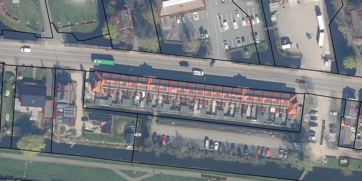 Het perceel waarop Zijde 408 staat heeft een oppervlakte van 2654 m². Dit is een zeer groot perceel. De perceeloppervlakte wordt geregistreerd door het Kadaster. Gedetailleerde informatie over de maten van dit perceel kunt u vinden in het rapport Kadastrale kaart met maatvoering van Zijde 408.