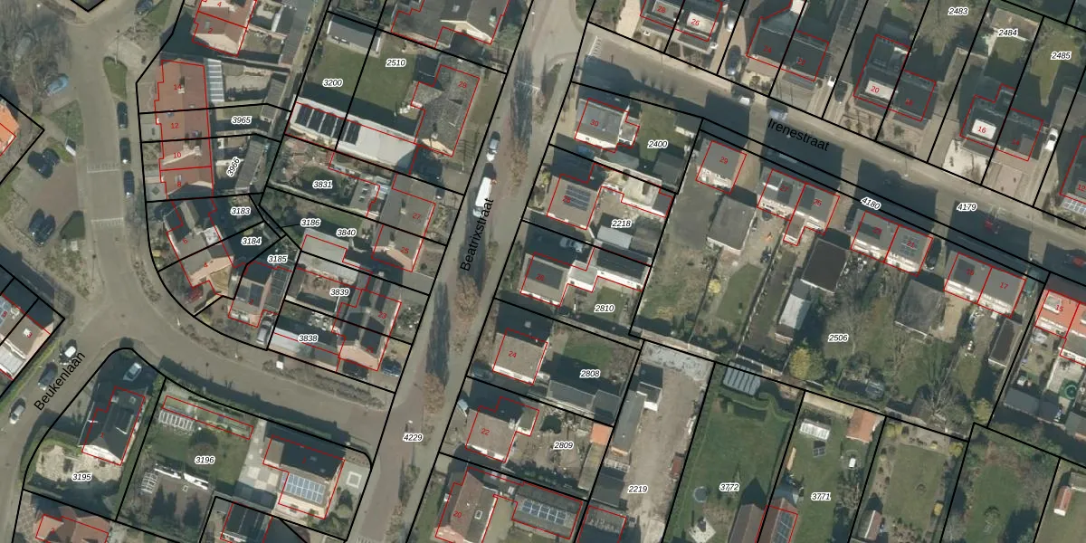 Het perceel waarop Beatrixstraat 26 staat heeft een oppervlakte van 401 m². Dit is een groot perceel. De perceeloppervlakte wordt geregistreerd door het Kadaster. Gedetailleerde informatie over de maten van dit perceel kunt u vinden in het rapport Kadastrale kaart met maatvoering van Beatrixstraat 26.