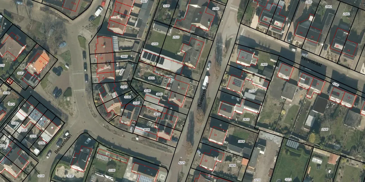 Het perceel waarop Beatrixstraat 27 staat heeft een oppervlakte van 350 m². Dit is een groot perceel. De perceeloppervlakte wordt geregistreerd door het Kadaster. Gedetailleerde informatie over de maten van dit perceel kunt u vinden in het rapport Kadastrale kaart met maatvoering van Beatrixstraat 27.