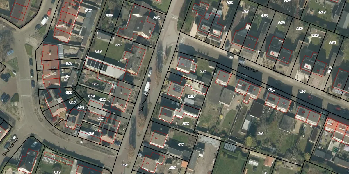 Het perceel waarop Beatrixstraat 28 staat heeft een oppervlakte van 363 m². Dit is een groot perceel. De perceeloppervlakte wordt geregistreerd door het Kadaster. Gedetailleerde informatie over de maten van dit perceel kunt u vinden in het rapport Kadastrale kaart met maatvoering van Beatrixstraat 28.