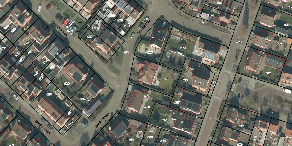 Beukenlaan 3 is gelegen op kadastraal perceel HVN00G3194. Deze kadastrale aanduiding is uniek en wordt gebruikt door het Kadaster om eigendomsrechten en andere zakelijke rechten vast te leggen. Het perceel maakt onderdeel uit van de kadastrale gemeente Hoeven.