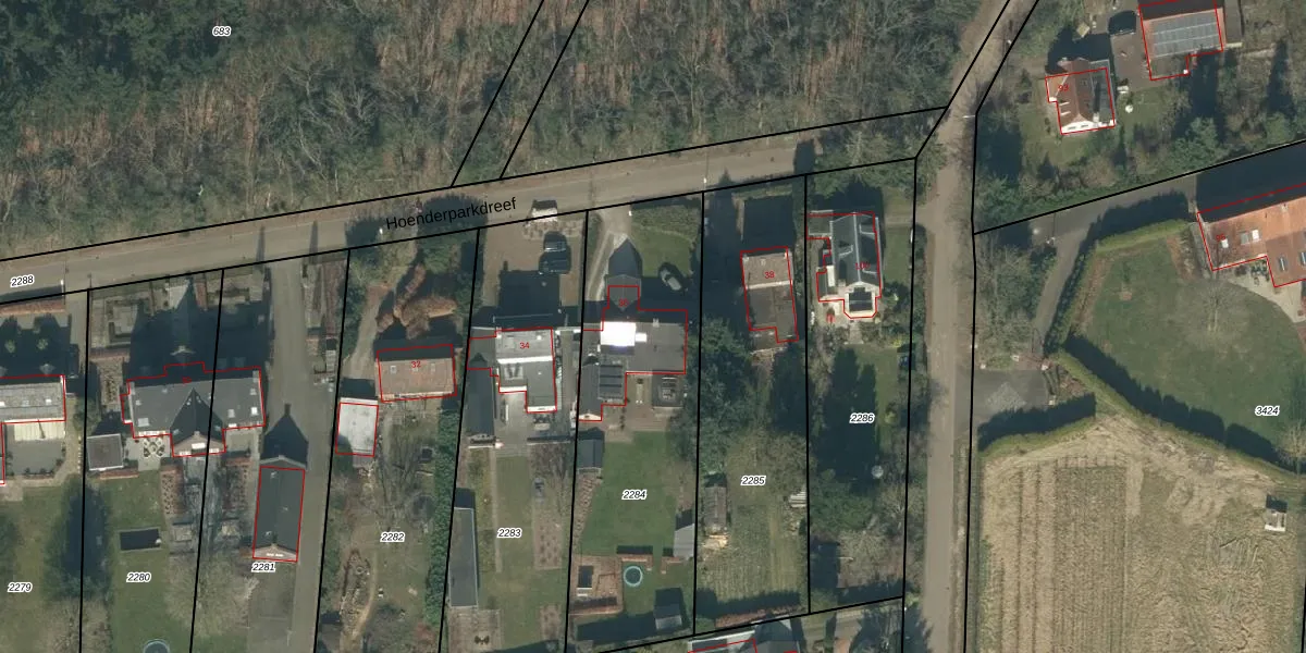 Hoenderparkdreef 36 is gelegen op kadastraal perceel HVN00G2284. Deze kadastrale aanduiding is uniek en wordt gebruikt door het Kadaster om eigendomsrechten en andere zakelijke rechten vast te leggen. Het perceel maakt onderdeel uit van de kadastrale gemeente Hoeven.