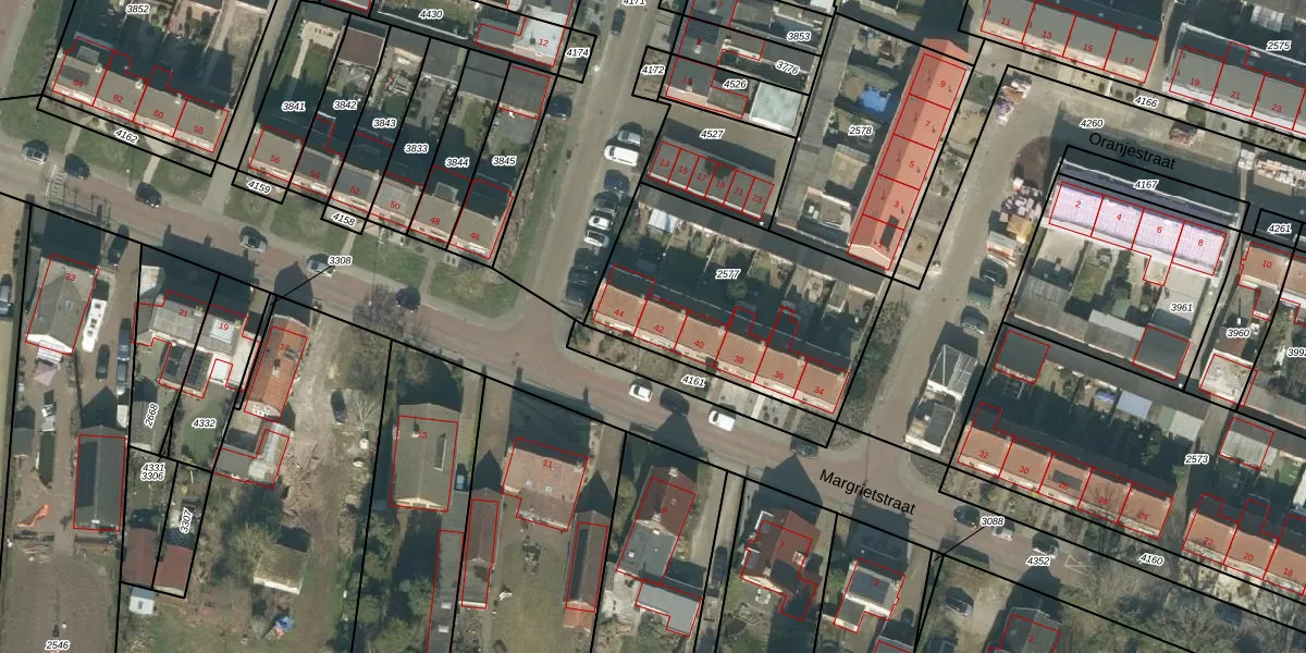 Het perceel waarop Margrietstraat 42 staat heeft een oppervlakte van 977 m². Dit is een groot perceel. De perceeloppervlakte wordt geregistreerd door het Kadaster. Gedetailleerde informatie over de maten van dit perceel kunt u vinden in het rapport Kadastrale kaart met maatvoering van Margrietstraat 42.