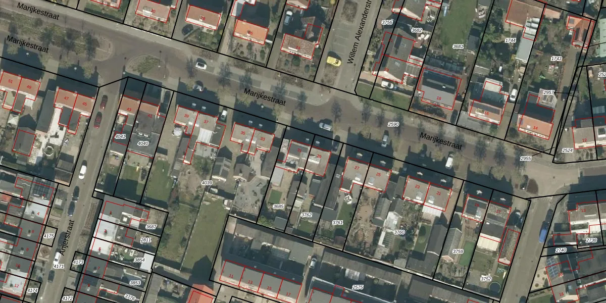 Het perceel waarop Marijkestraat 31 staat heeft een oppervlakte van 330 m². Dit is een groot perceel. De perceeloppervlakte wordt geregistreerd door het Kadaster. Gedetailleerde informatie over de maten van dit perceel kunt u vinden in het rapport Kadastrale kaart met maatvoering van Marijkestraat 31.