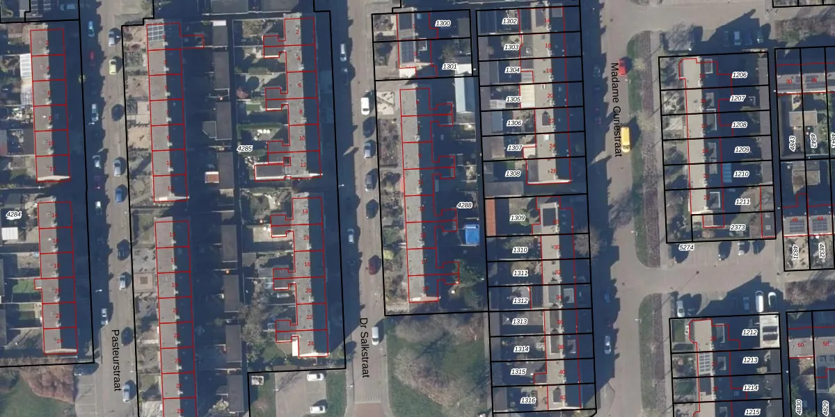Het perceel waarop Dr Salkstraat 13 staat heeft een oppervlakte van 1405 m². Dit is een zeer groot perceel. De perceeloppervlakte wordt geregistreerd door het Kadaster. Gedetailleerde informatie over de maten van dit perceel kunt u vinden in het rapport Kadastrale kaart met maatvoering van Dr Salkstraat 13.