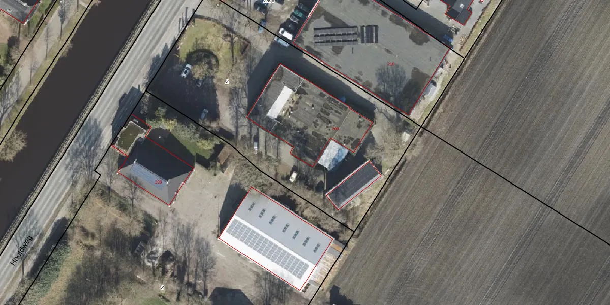 Het perceel waarop Hoofdweg 210 staat heeft een oppervlakte van 3246 m². Dit is een zeer groot perceel. De perceeloppervlakte wordt geregistreerd door het Kadaster. Gedetailleerde informatie over de maten van dit perceel kunt u vinden in het rapport Kadastrale kaart met maatvoering van Hoofdweg 210.