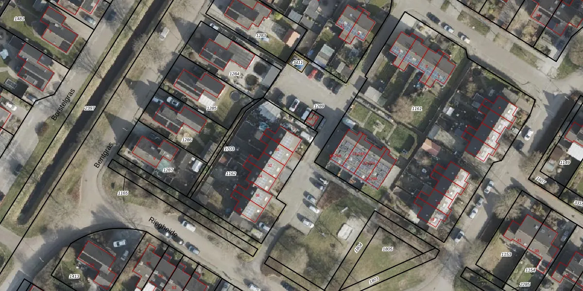 Het perceel waarop Riegheide 28 staat heeft een oppervlakte van 1117 m². Dit is een zeer groot perceel. De perceeloppervlakte wordt geregistreerd door het Kadaster. Gedetailleerde informatie over de maten van dit perceel kunt u vinden in het rapport Kadastrale kaart met maatvoering van Riegheide 28.