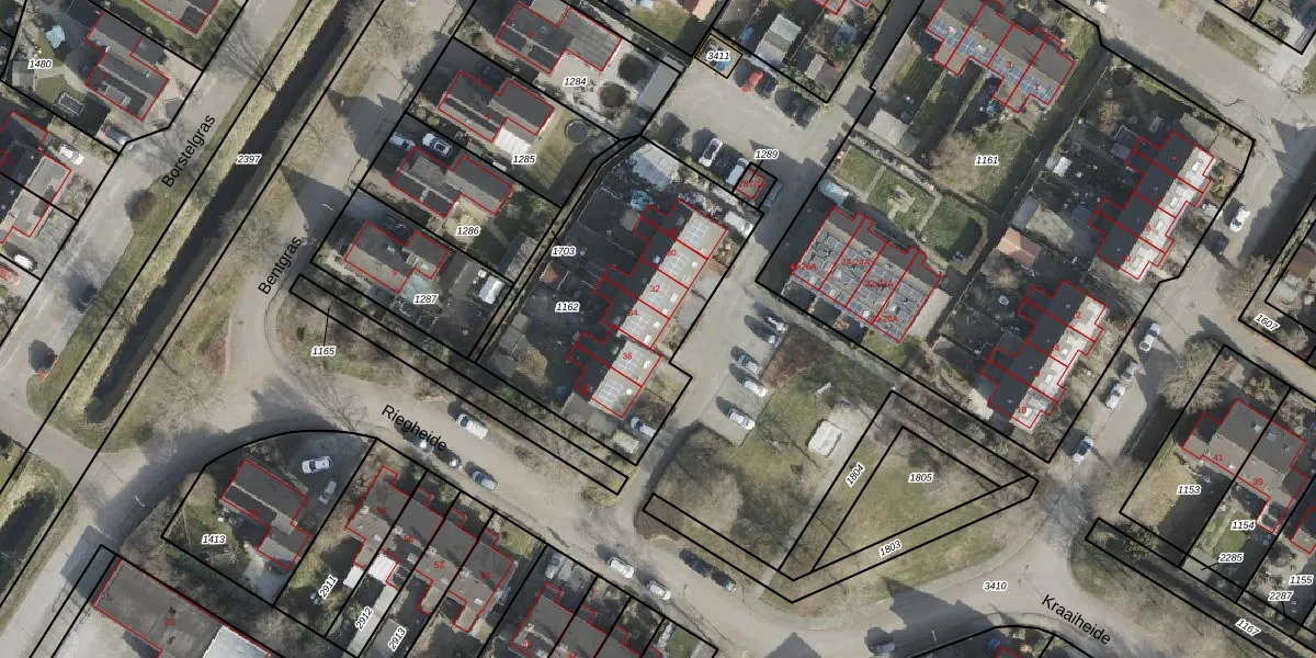 Het perceel waarop Riegheide 34 staat heeft een oppervlakte van 1117 m². Dit is een zeer groot perceel. De perceeloppervlakte wordt geregistreerd door het Kadaster. Gedetailleerde informatie over de maten van dit perceel kunt u vinden in het rapport Kadastrale kaart met maatvoering van Riegheide 34.