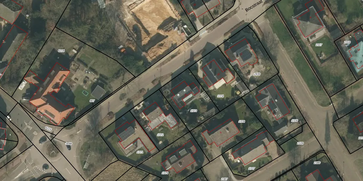 Het perceel waarop Bocstraat 16 staat heeft een oppervlakte van 585 m². Dit is een groot perceel. De perceeloppervlakte wordt geregistreerd door het Kadaster. Gedetailleerde informatie over de maten van dit perceel kunt u vinden in het rapport Kadastrale kaart met maatvoering van Bocstraat 16.