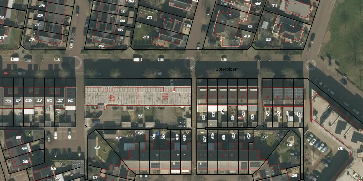 Boterbloem 52 is gelegen op kadastraal perceel BMR00S543. Deze kadastrale aanduiding is uniek en wordt gebruikt door het Kadaster om eigendomsrechten en andere zakelijke rechten vast te leggen. Het perceel maakt onderdeel uit van de kadastrale gemeente Boxmeer.