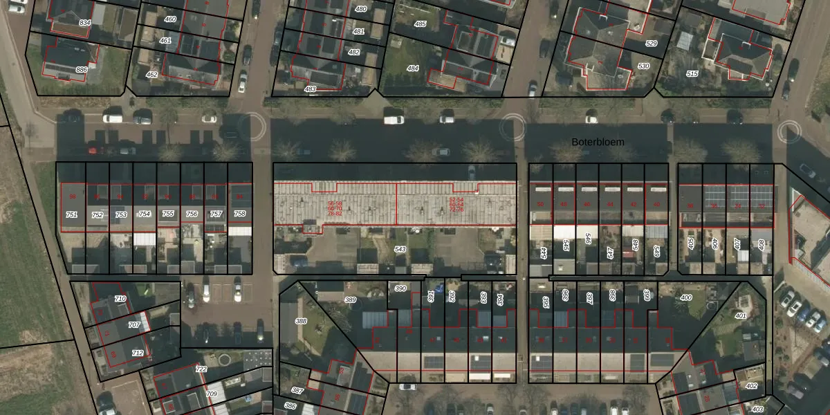 Boterbloem 64 is gelegen op kadastraal perceel BMR00S543. Deze kadastrale aanduiding is uniek en wordt gebruikt door het Kadaster om eigendomsrechten en andere zakelijke rechten vast te leggen. Het perceel maakt onderdeel uit van de kadastrale gemeente Boxmeer.