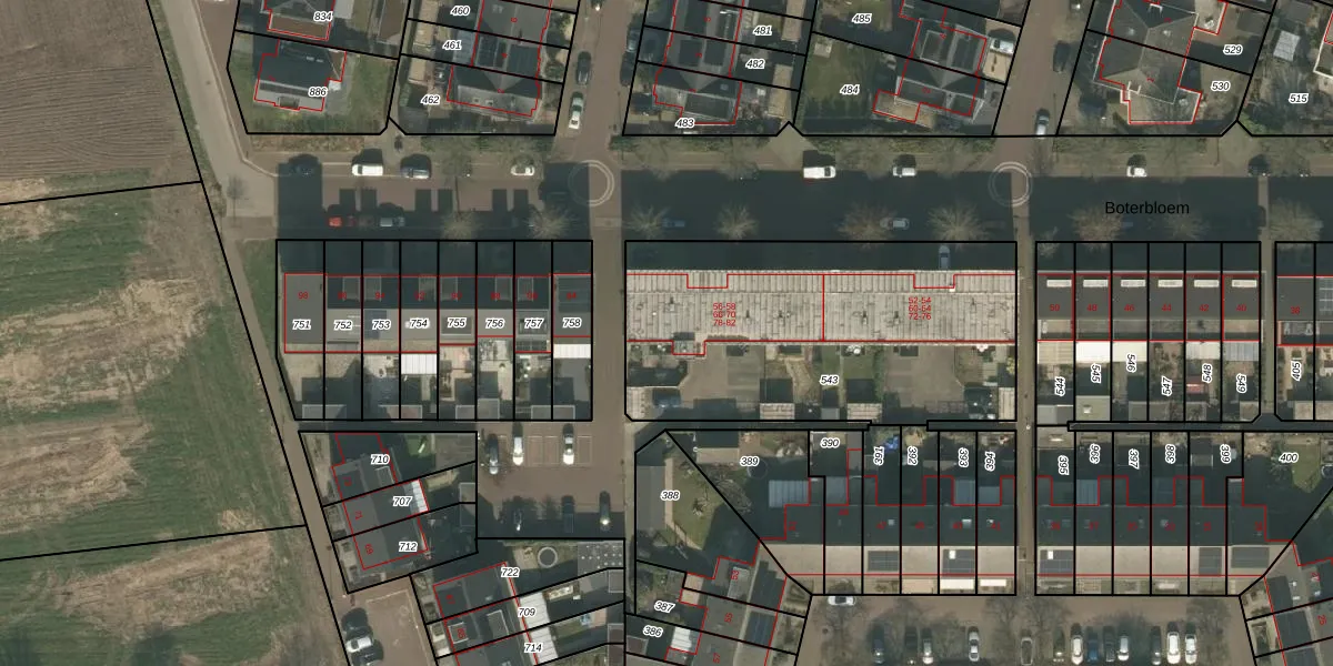 Boterbloem 82 is gelegen op kadastraal perceel BMR00S543. Deze kadastrale aanduiding is uniek en wordt gebruikt door het Kadaster om eigendomsrechten en andere zakelijke rechten vast te leggen. Het perceel maakt onderdeel uit van de kadastrale gemeente Boxmeer.