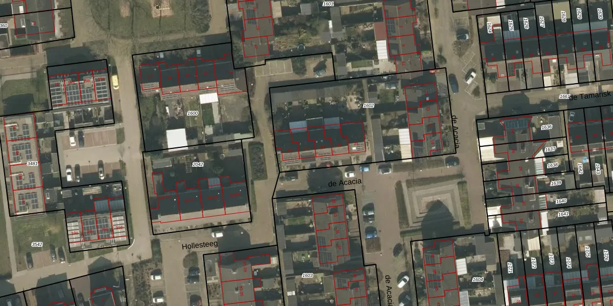Het perceel waarop de Acacia 27 staat heeft een oppervlakte van 1626 m². Dit is een zeer groot perceel. De perceeloppervlakte wordt geregistreerd door het Kadaster. Gedetailleerde informatie over de maten van dit perceel kunt u vinden in het rapport Kadastrale kaart met maatvoering van de Acacia 27.