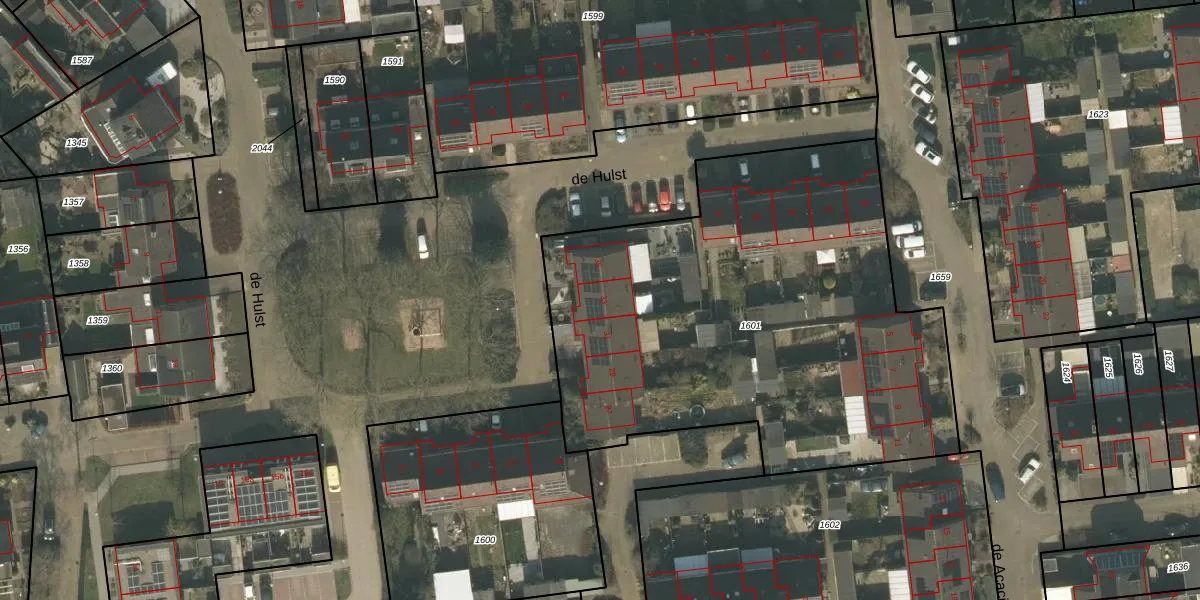 Het perceel waarop de Hulst 33 staat heeft een oppervlakte van 2718 m². Dit is een zeer groot perceel. De perceeloppervlakte wordt geregistreerd door het Kadaster. Gedetailleerde informatie over de maten van dit perceel kunt u vinden in het rapport Kadastrale kaart met maatvoering van de Hulst 33.