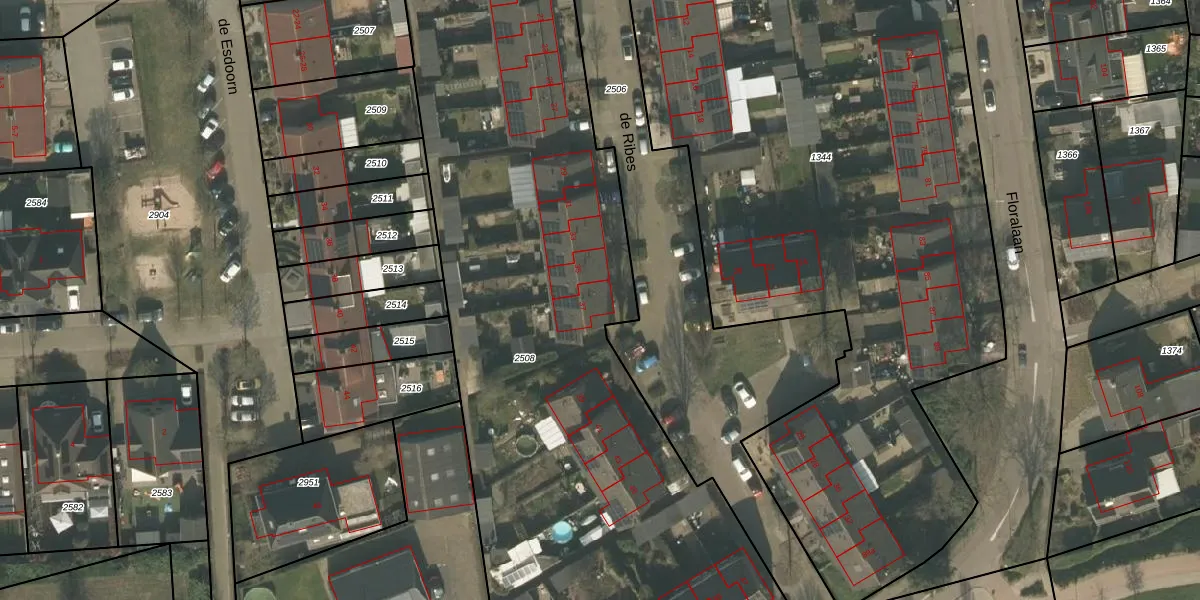 Het perceel waarop de Ribes 37 staat heeft een oppervlakte van 4485 m². Dit is een zeer groot perceel. De perceeloppervlakte wordt geregistreerd door het Kadaster. Gedetailleerde informatie over de maten van dit perceel kunt u vinden in het rapport Kadastrale kaart met maatvoering van de Ribes 37.