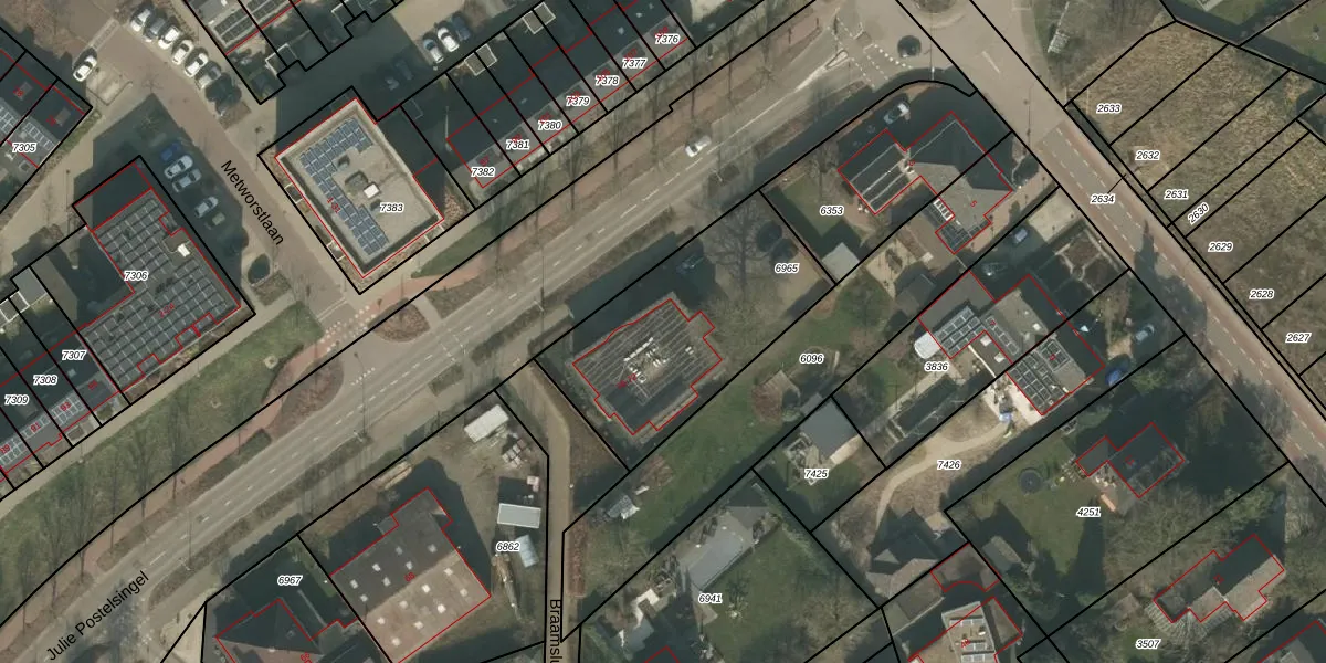 Het perceel waarop Julie Postelsingel 72 staat heeft een oppervlakte van 866 m². Dit is een groot perceel. De perceeloppervlakte wordt geregistreerd door het Kadaster. Gedetailleerde informatie over de maten van dit perceel kunt u vinden in het rapport Kadastrale kaart met maatvoering van Julie Postelsingel 72.