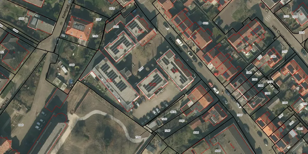 Het perceel waarop Marktstraat 29-a staat heeft een oppervlakte van 3321 m². Dit is een zeer groot perceel. De perceeloppervlakte wordt geregistreerd door het Kadaster. Gedetailleerde informatie over de maten van dit perceel kunt u vinden in het rapport Kadastrale kaart met maatvoering van Marktstraat 29-a.
