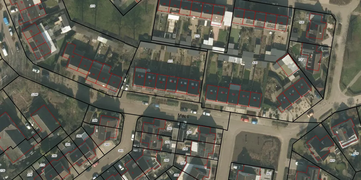 Het perceel waarop Mees 57 staat heeft een oppervlakte van 1184 m². Dit is een zeer groot perceel. De perceeloppervlakte wordt geregistreerd door het Kadaster. Gedetailleerde informatie over de maten van dit perceel kunt u vinden in het rapport Kadastrale kaart met maatvoering van Mees 57.